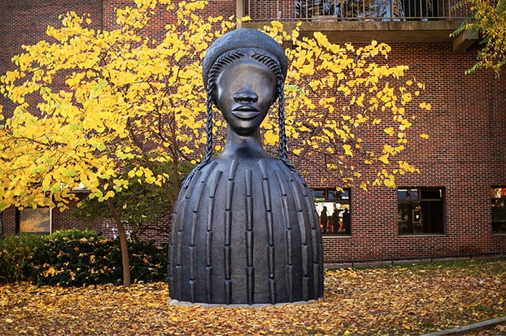 Simone Leigh’s captivating sculptural work takes up space in many facets. Her art centers Black women's histories, experiences, and resilience with monumental forms, often inspired by African and African diasporic traditions, like her Sentinel (Mami Wata—a West African water spirit akin to mermaids or sirens, yet different.) They command physical and symbolic space, asserting presence and identity. For instance, in Brick House (above), a 16-foot-tall bronze sculpture of a woman with a dome-like torso, the figure becomes an anchor within its environment, conjuring connection, curiosity, and attention. Leigh’s use of space emphasizes power and protection, creating environments where marginalized histories are honored and reclaimed. It’s long overdue for these voices and stories to materialize in the same monumental manner as many oppressors have been, but Leigh has communicated that she doesn’t desire the responsibility of replacing one for another— they are to shine in their own right; their own light.