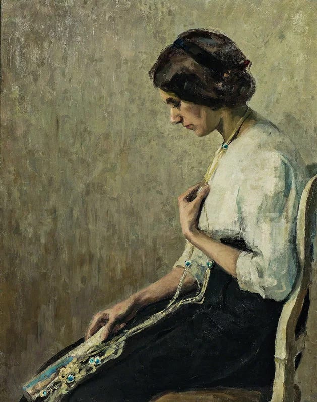 This painting captured my attention immediately. I even felt compelled to say, “Okay, Cecilia Beaux may be my favorite impressionist.” The muted, earthy colors with touches of turquoise were an initial pull. The strong and subtle contrasts create a melancholy mood, enhanced by the subject's downward gaze and how she touches her pendant? It's as if she's seeking comfort or reassurance. What must she be going through?