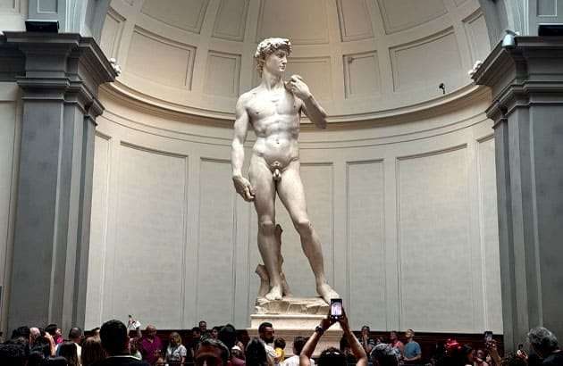 Michelangelo's sculpture "David" masterfully captures the human form in marble. However, when looking at it in La Academia, you will notice that his hands are * huge .* This is because he was intended to stand well above the audience on the facade of a building. As a result, Michelangelo di Lodovico Buonarroti Simoni (or Michelangelo for short) expertly crafted his proportions accordingly. Decisions were later made to have him on display in a museum, so for keen observers, you may notice that his hands seem a little off.