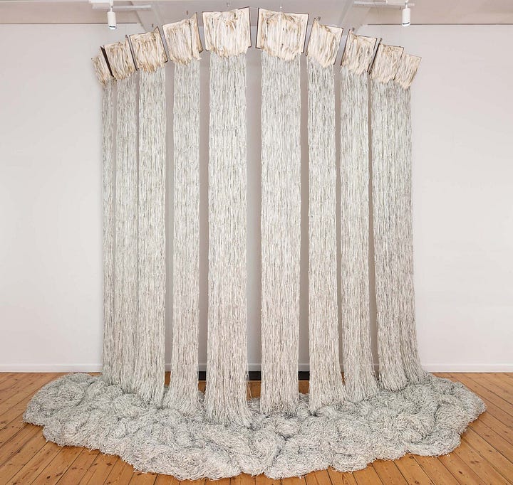 Kwon’s art engages space as an active participant in the viewer’s experience. Her installations often respond to the architecture of their setting, with tendrils of paper flowing across floors, walls, or ceilings. This interaction invites viewers to navigate her works, emphasizing the fluidity of space and the transformation of static objects into dynamic, spatial narratives. By deconstructing books, Kwon reclaims space as a site of creativity and rebirth, turning remnants of the past into living, immersive environments. It is truly amazing how expansive these pieces can be from the simple pages of the books they sprawl from.