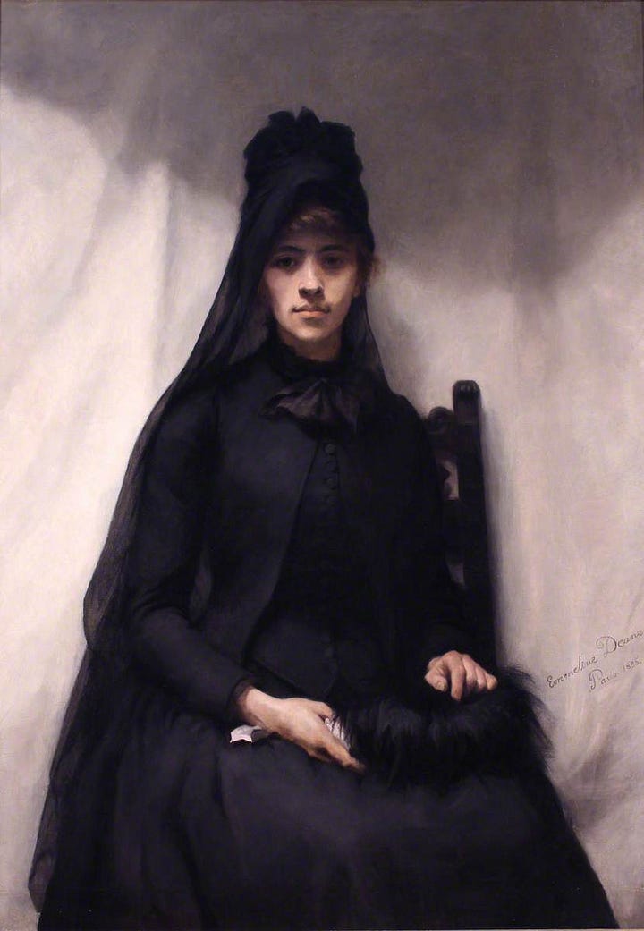 Anna Bilińska-Bohdanowicz deftly employs contrast, color theory, and brush strokes in her paintings for dramatic effect. This Ukrainian painter is one of my favorites for her portraiture. In this portrait of Anna Bilińska-Bohdanowicz by Emmeline Deane, titled Anna Bilinska (1857–1893), There is a softness, with the pale mauve backdrop offsetting the mourning dress of the subject. While there is a strong contrast between the background and the woman, the garments hold very little contrast, adding a weightiness to them.