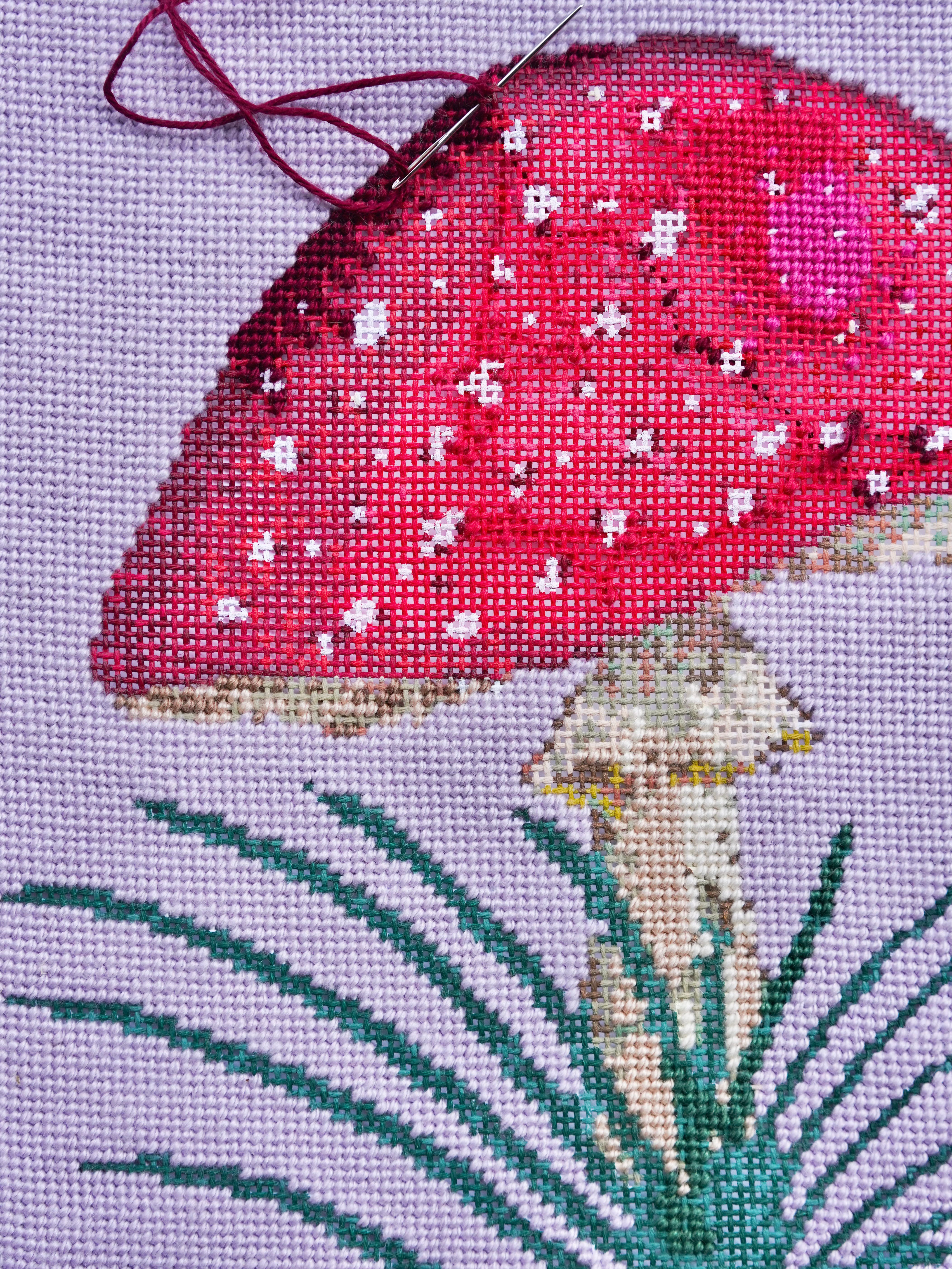 When stitching over a painted canvas, you may choose to work in a thread color that’s different from what’s painted beneath. I do this all the time, even with my own designs! For example, my fly agaric canvas above comes with a white background, but I chose Silk & Ivory’s Amethyst instead.