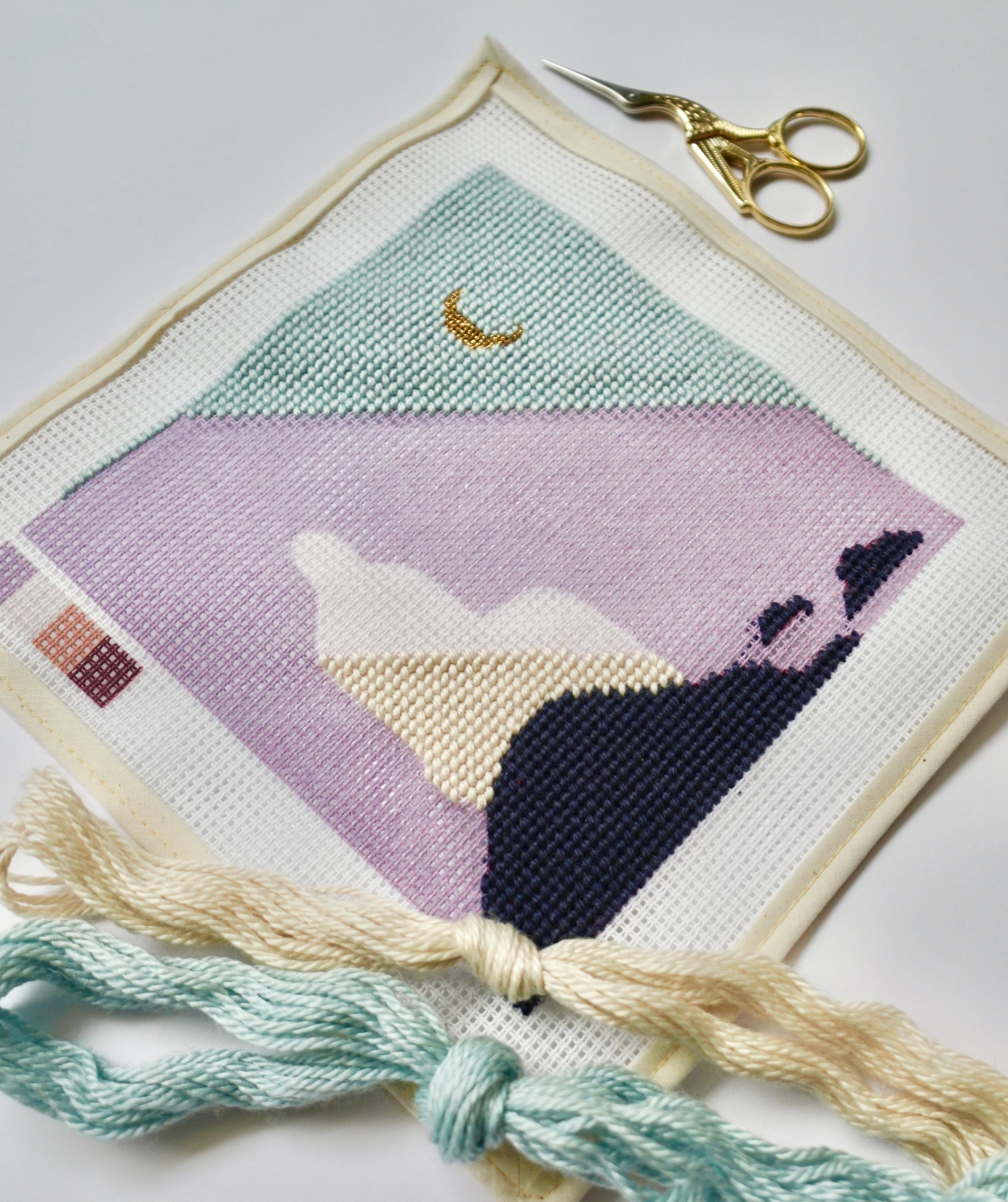 When stitching over a painted canvas, you may choose to work in a thread color that’s different from what’s painted beneath.