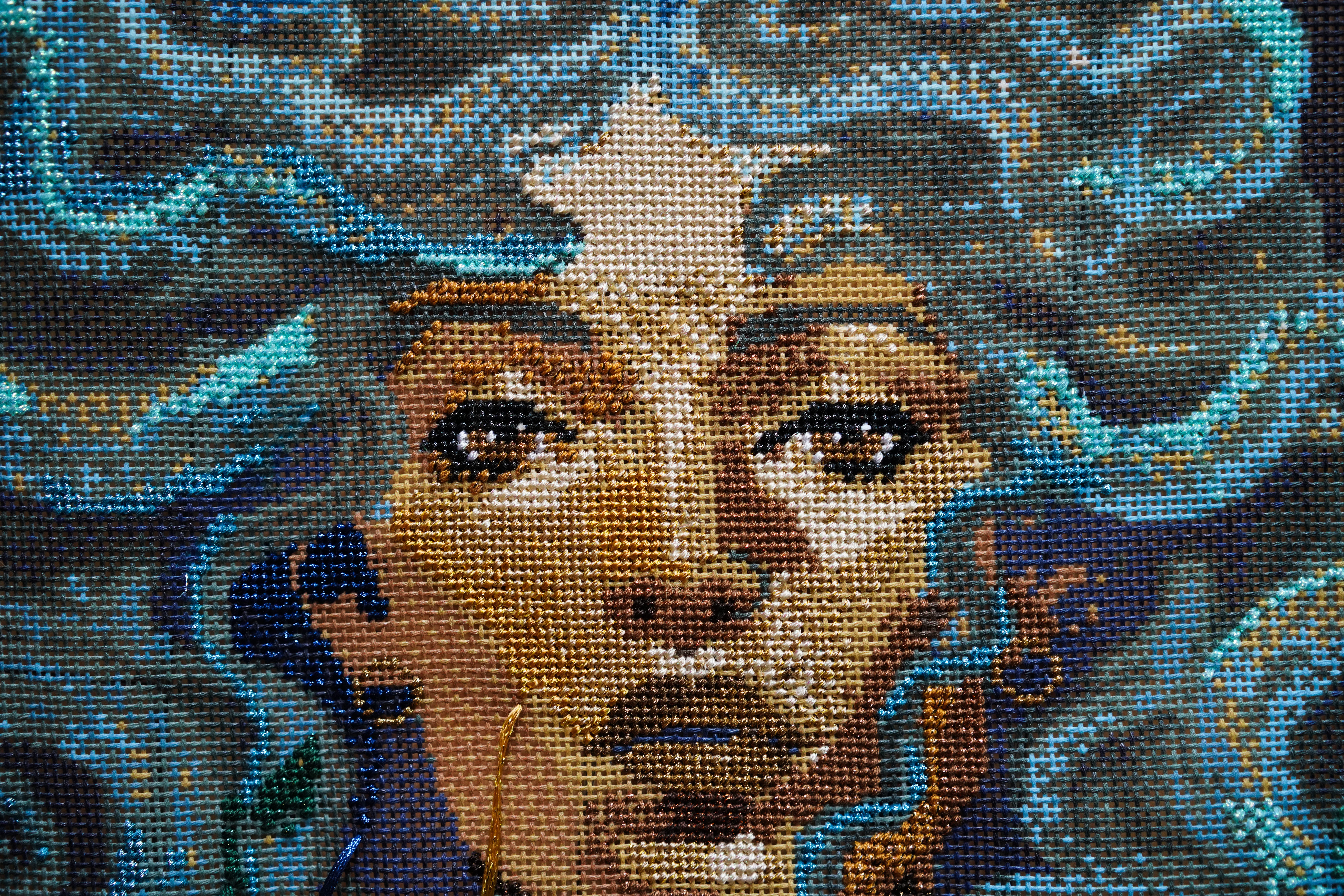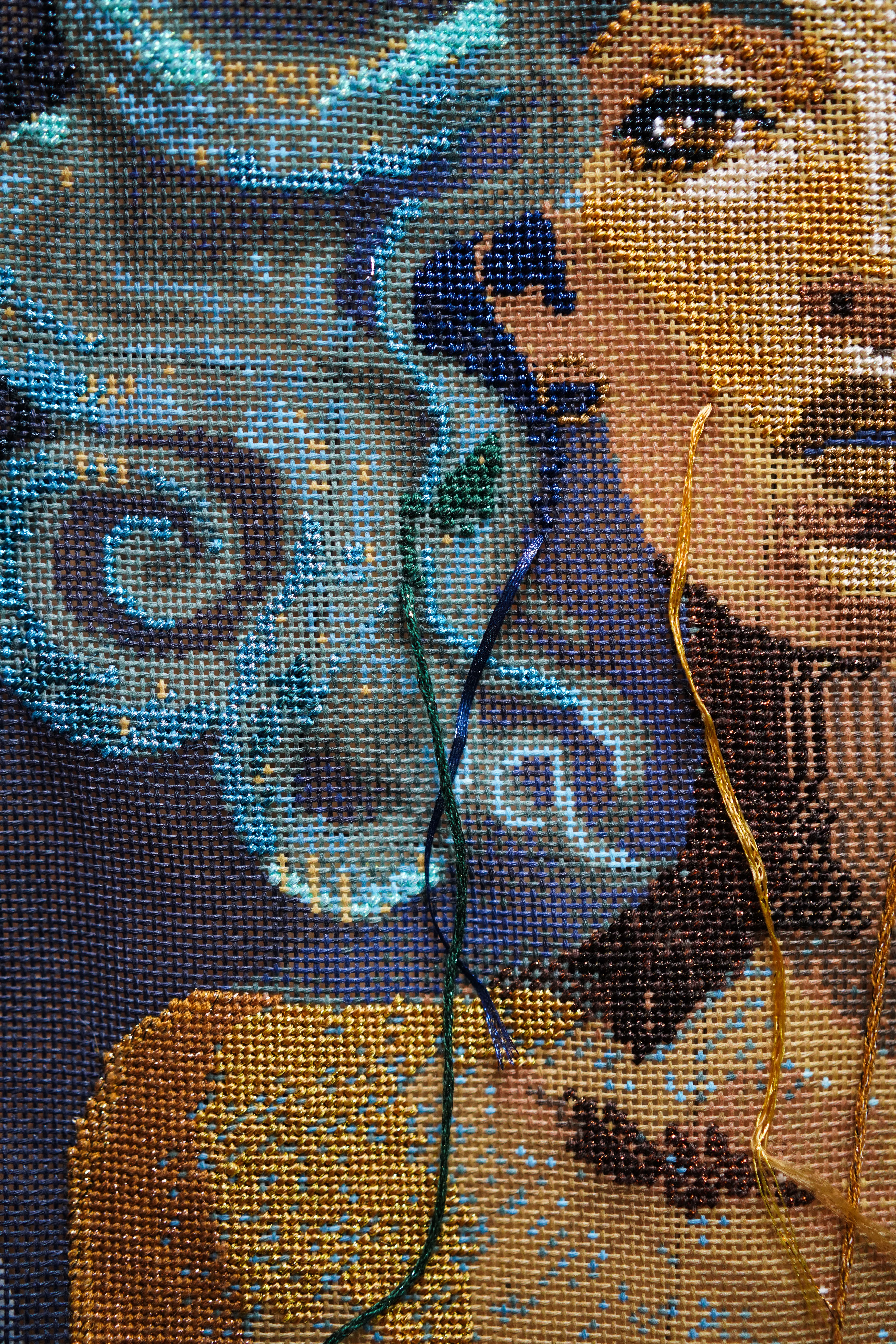 This project may be massive, and the sparkly threads may make my head spin at times as ends fray, but slowly and surely, I’m bringing her to life one stitch at a time.